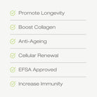 Migliorando la salute delle articolazioni, delle ossa, del sistema immunitario e del cuore, la nostra molecola incrementa la resilienza cellulare, contribuendo a una vita più lunga e sana.